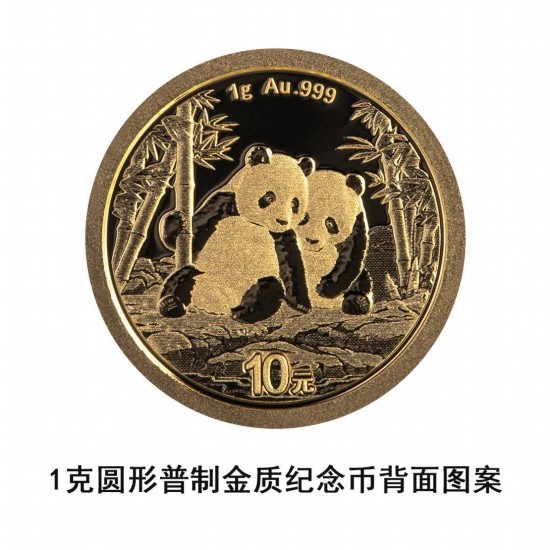 1克圆形金质纪念币为普制币,含纯金1克,直径10毫米,面额10元,成色99.9%,最大发行量500000枚。