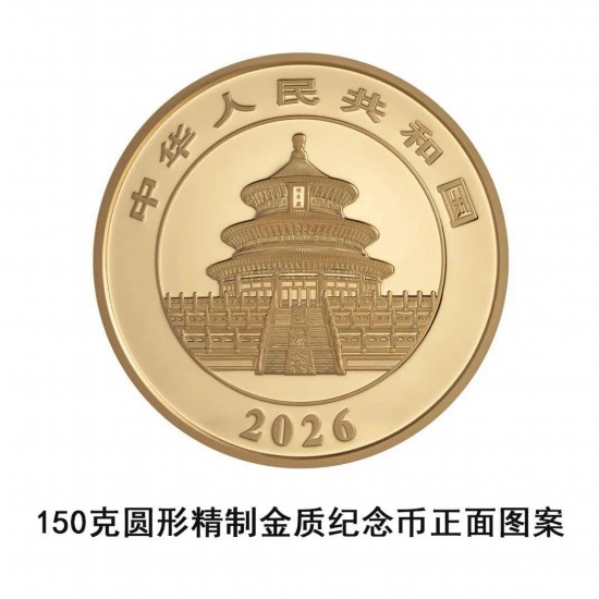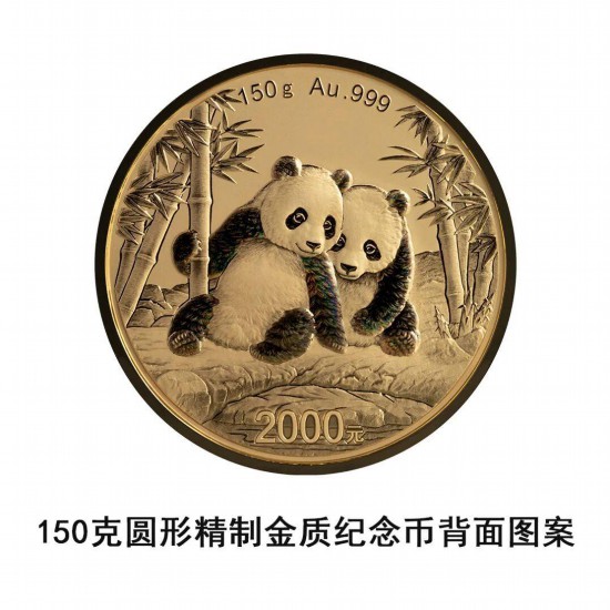 150克圆形金质纪念币为精制币,含纯金150克,直径60毫米,面额2000元,成色99.9%,最大发行量5000枚。
